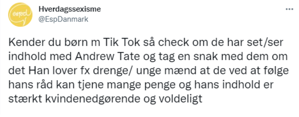 Sådan noget som, du ved, det behøver ikke rigtigt at blive forklaret, for vi har alle taget stilling til det. Her er ingen reflekteren over det antagonistiske begreb ‘feminist’. Tates “budskaber er farlige. Derfor er det godt, at han nu er fortid på sociale medier.”