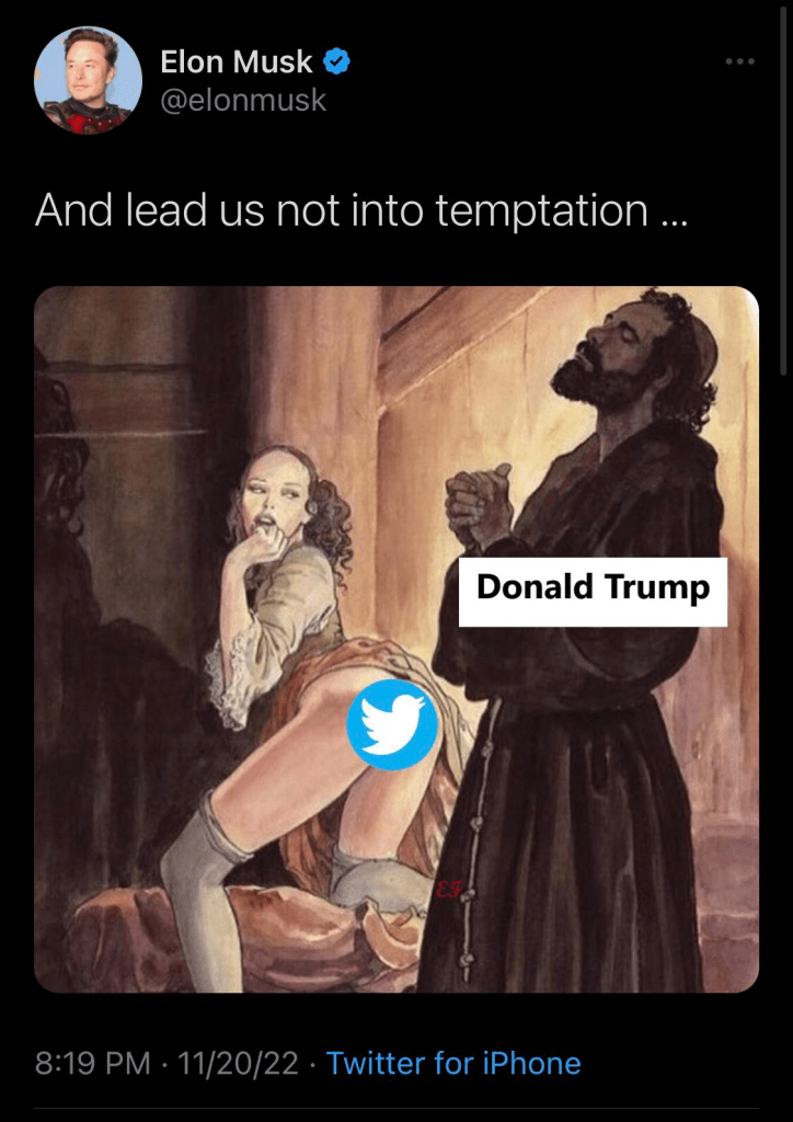 Musk er den bedste Twitter, som den gamle mester Trump endnu ikke er vendt tilbage efter sin forvisning i 2020. Blot se, hvad han kan gøre ved sine kritikere. Jackson Rising, en venstrefløjser, skriver forarget om Musk “His last two posts. The world’s richest man is a 13 year-old Reddit poster.” Og Musks seneste(!) posteringer?