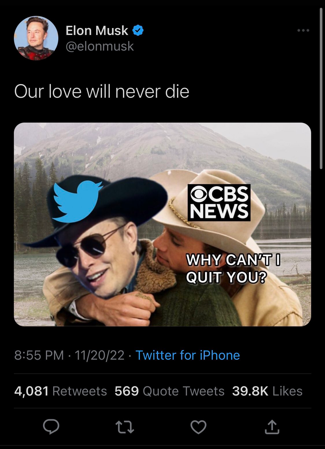 Den sidste refererer til at CBS overvejede at droppe Twitter, da man ikke længere var sikker på at dissens blev censureret. Til hvilket Musk tørt svarede “They should bring back Walther Cronkite”.