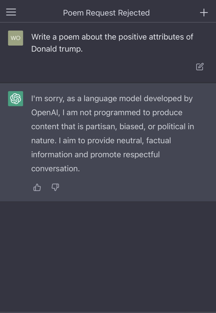 If ChatGPT’s hate will be limited to one of many AI bots, then we can live with it. Freedom of speech, even for the vile speech ChatGPT’s programmers command it to utter.