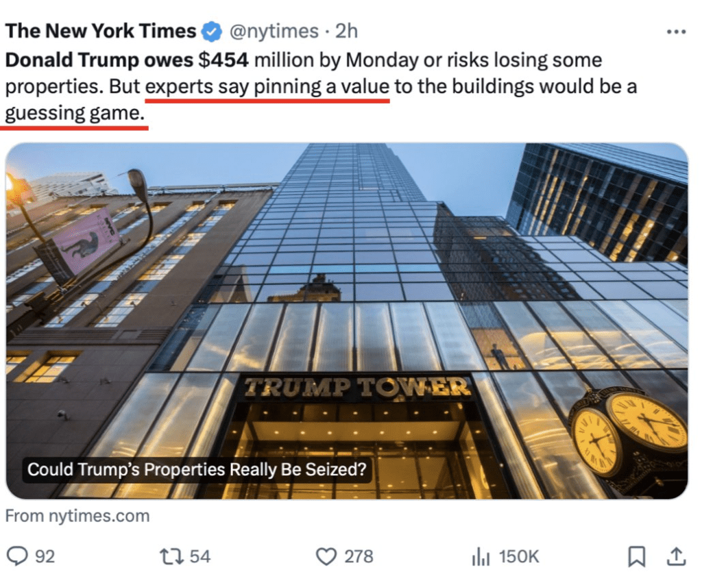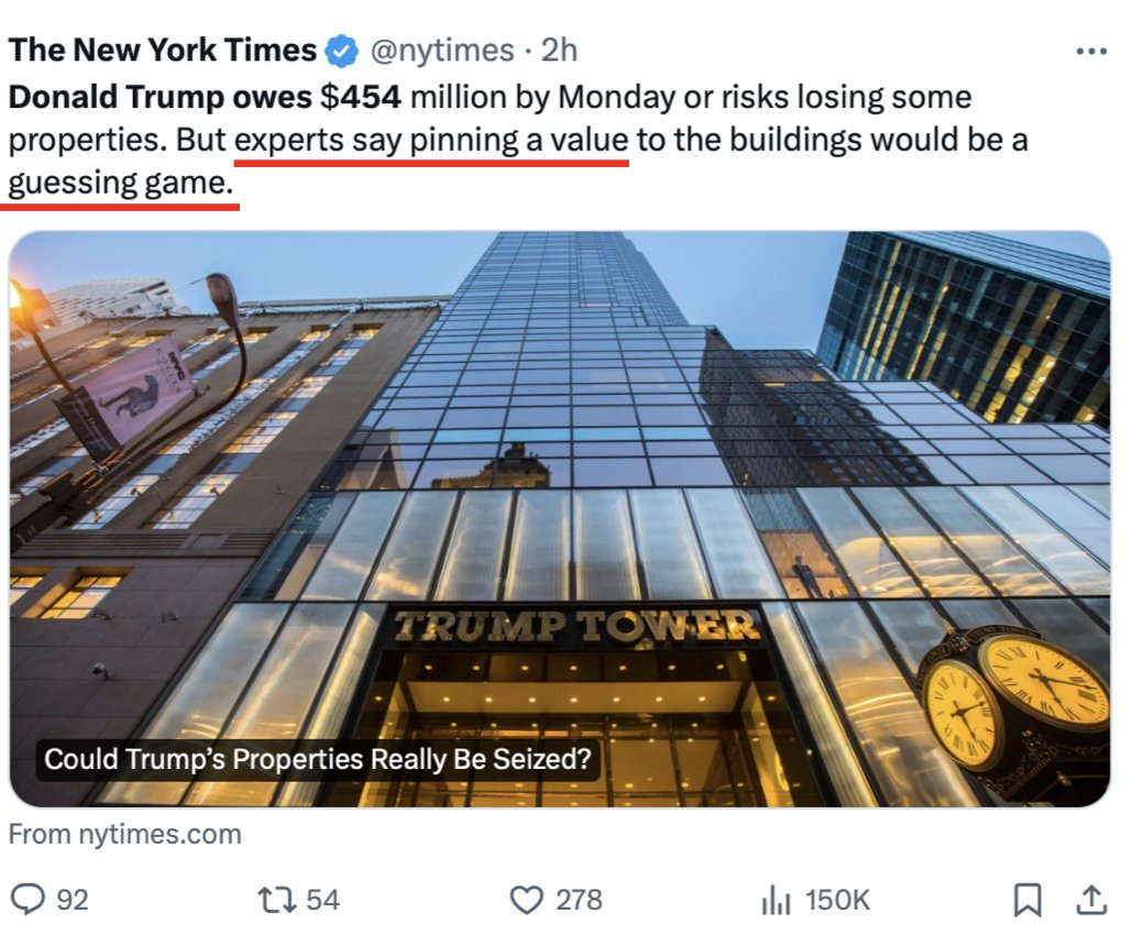 Talkshow værten Stephen Colbert hoverede over kendelsen foran et jublende New Yorker publikum, der i sig selv forklarede hvorledes Letitia James var blevet valgt til at “få ram på Trump”, som hun havde lovet dem. James selv var lige så hoverende og posterede blot “$464,576,230.62” på X. Den tidligere CBS journalist for 60 Minutes, Dan Rather, gentog James pointe og tilføjede “I hear Mar-a-Lago may have some value”. Og nu, hvor det ikke længere skal bruges til noget, istemte CNN den vurdering og mente nu, at Trumps hjem i Florida nu ikke længere var de 18 mio. dollars værd, som James og dommer Engoron, havde påstået, men nu flere hundrede millioner dollars.