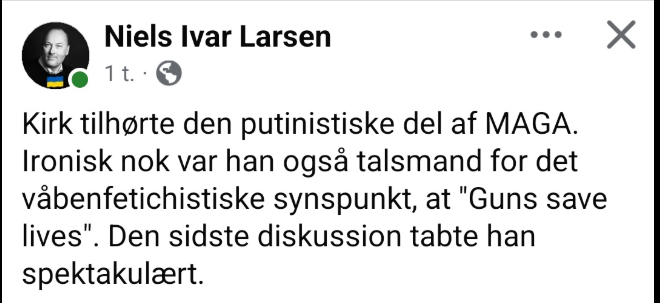 “En lektor, der hverken kan fordrage Mette Frederiksen eller Jyllands-Posten, mener, at verden er et bedre sted, efter at Donald Trump-støtten Charlie Kirk er blevet dræbt.” skriver Jyllands Posten. “Verden er et bedre sted uden ham, og ingen vil få mig til at sige andet,” istemte præsten Johannes Bollman på Facebook, hvor han også kalder “Charlie Kirk for “en ond mand”, “racistisk”, “fascistisk” og “xenofobisk”.” skriver Uwe Max Jensen. Bollman tilføjer “Jeg ville også græde tørre tåre, hvis Trump blev nakket,” – han blev altså kun advaret ifølge Snaphanen.