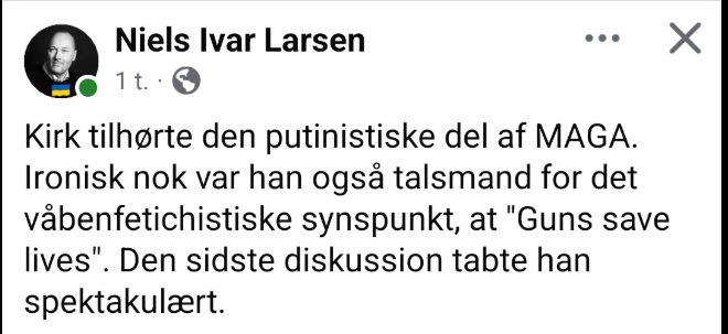 Men de fleste reaktioner har blot været misforståede. “Deres skæbner fortjener at blive sidestillet” skriver skuespilleren Lars Bom således, som svar på den opmærksomhed mordet på Charlie Kirk har fået, som han modstiller med mordene på politikeren Melissa Hortman og hendes mand Mark samt parrets hund(!). Jeg er enig i at deres skæbner fortjener at blive sidestillet, som alle der myrdes. Men det er ikke pointen med den opmærksomhed, mordet på Kirk har vakt.