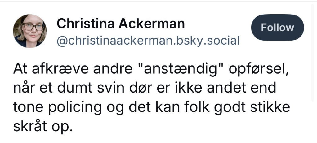 Transaktivisten Woke Ting At Sige “Charlie Kirk’s kone og to små børn er bedre stillet uden ham.”. Damen herunder er en af de mange, der forlod X til fordel for Bluesky på grund af den grove tone.
