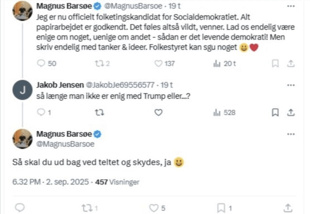 Da jeg først læste forargelsen over at Magnus Barsøe havde sagt at Trump støtter skulle “ud bag ved teltet og skydes, ja” var jeg overbevist om, at det var ment som en joke. Jeg er ingen fan af Barsøe, kan man nok regne ud, da jeg mener at Trump er det største, ikke blot siden skiveskåret brød, men endda siden gennemtræk blev opfundet.