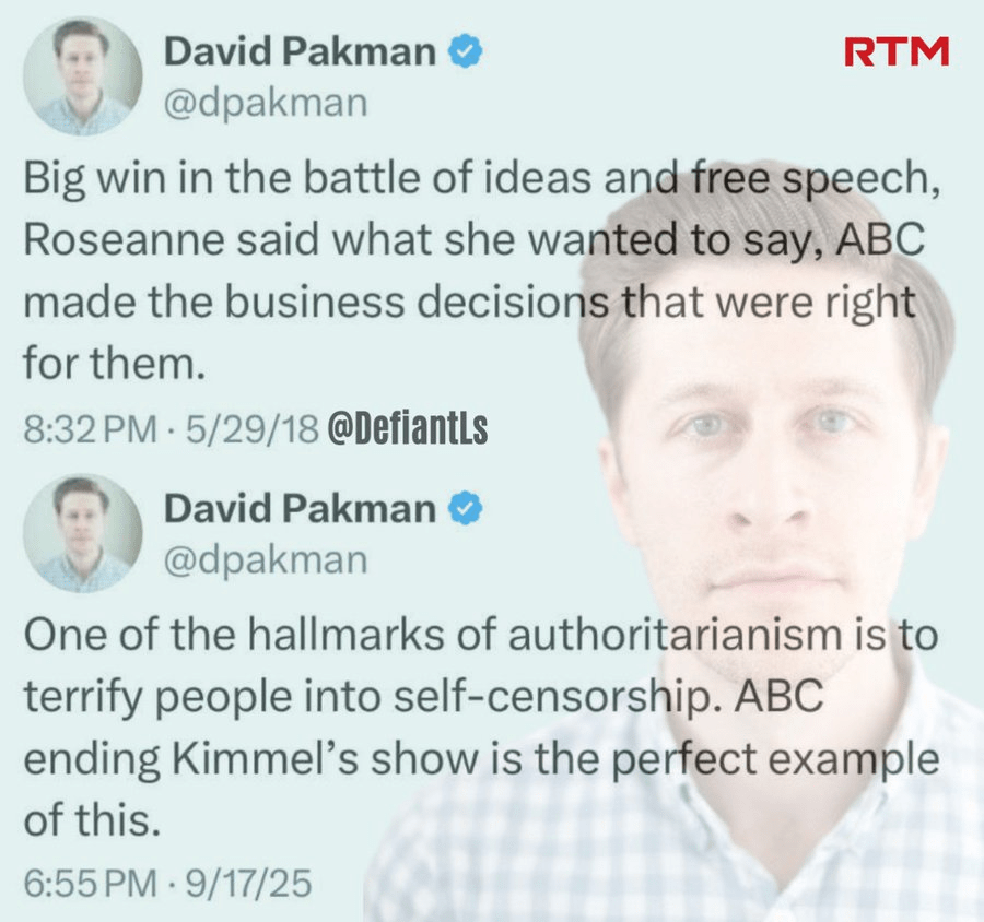 (…) Curiously, some of these politicians and pundits are claiming that, yet again, democracy will die if Kimmel is not allowed to spread disinformation. There are reports that Kimmel was refusing to apologize and planned to double down on the attacks on conservatives in his next show. Faced with a revolt by affiliates and a potential exodus of advertisers, Disney’s head, Bob Iger, pulled the plug. (By the way, Kimmel’s ratings had been falling for years, and he had a smaller audience than the Colbert Show, which was itself discontinued due to loss of money).