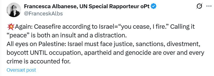 “Hamas har ikke godkendt afvæbning. Israel har ikke trukket dig ud. Fase 2 bliver noget af en gyser.” skrev Klaus Riskær Pedersen, “Men ser vi bort fra Trumps ‘celebration trip’ til Israel i dag, så må man tilskynde til optimisme når man ser den kreds der var samlet i Ægypten senere på dagen”.