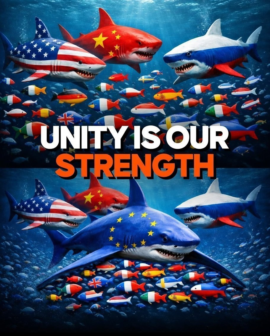 Europa-fiskene herunder er EU’s at fortære, er en typisk illustration i mit feed, fra mange pludseligt opståede pro EU X-profiler: