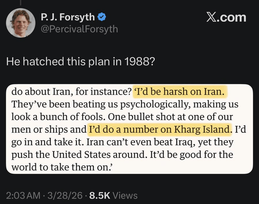 But what if it’s the other way around? What if he knew this would happen? Remember, Trump has been thinking about oil, the Strait of Hormuz, and even tiny Kharg Island since the 1980s.